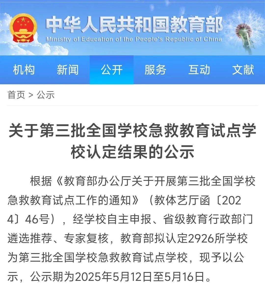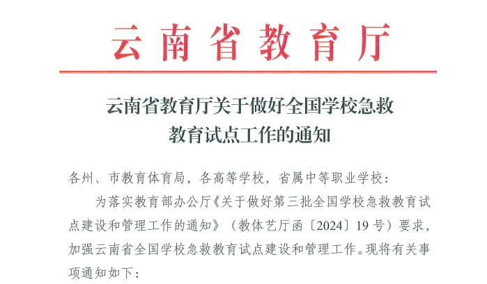 根据《教育部办公厅关于开展第三批全国学校急救教育试点工作的通知》(教体艺厅函〔2024〕46号),经学校自主申报、省级教育行政部门遴选推荐、专家复核,近日教育部发布公示,认定我校为第三批全国学校急救教育试点学校,这是对我校急救教育工作的认可,同时也为我校急救教育工作提出了新的要求。