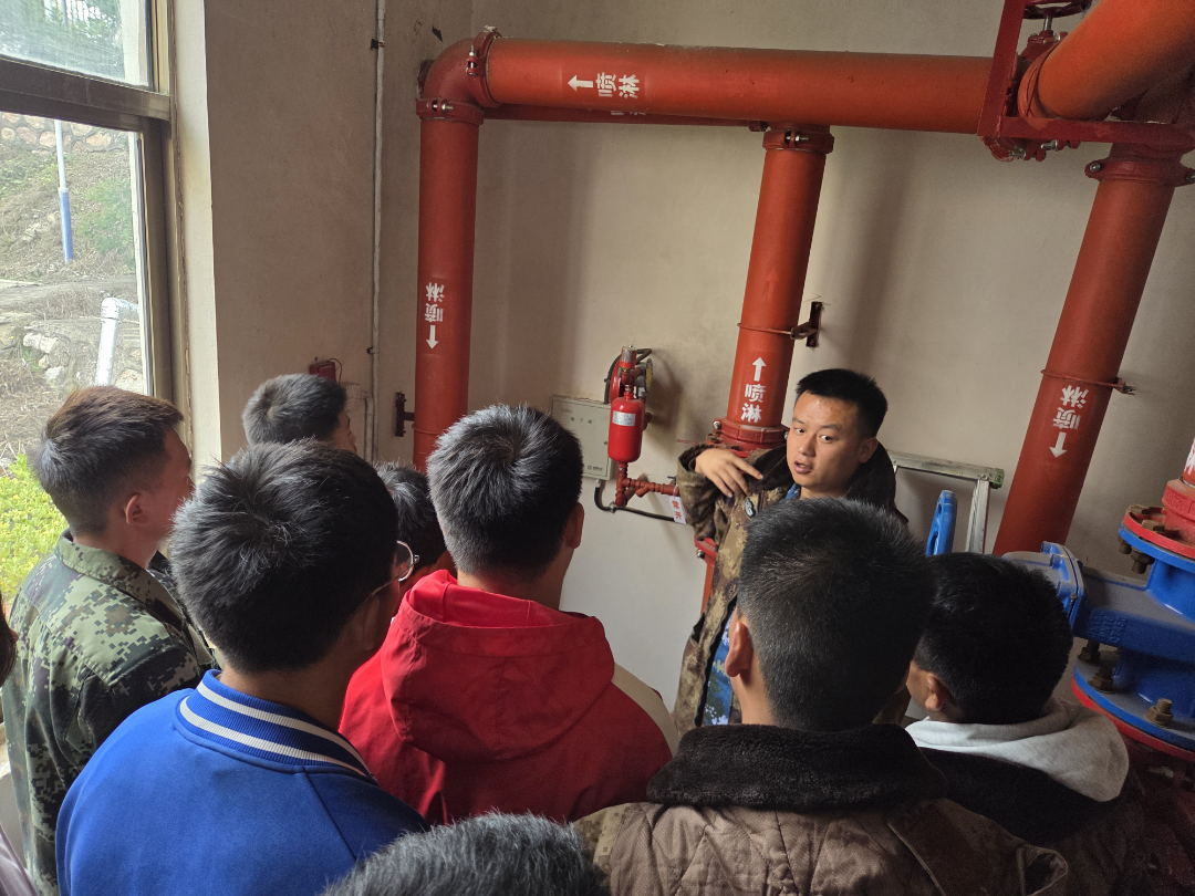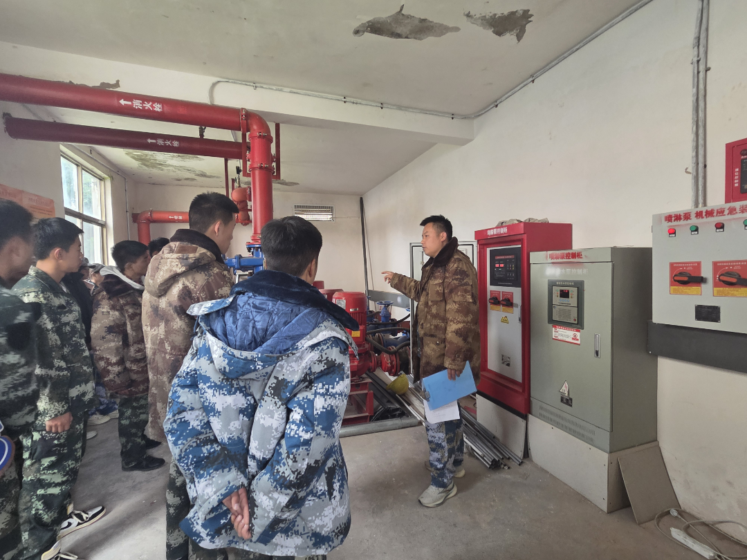 实践首站,同学们走进消防水泵房。朱建东教官现场讲解主泵与备泵“一用一备”的运行机制,演示自动、手动与机械应急三种启动模式。稳压装置与湿式报警阀的配合,让大家理解了系统如何在平时维持“战备状态”,灾时迅速响应。